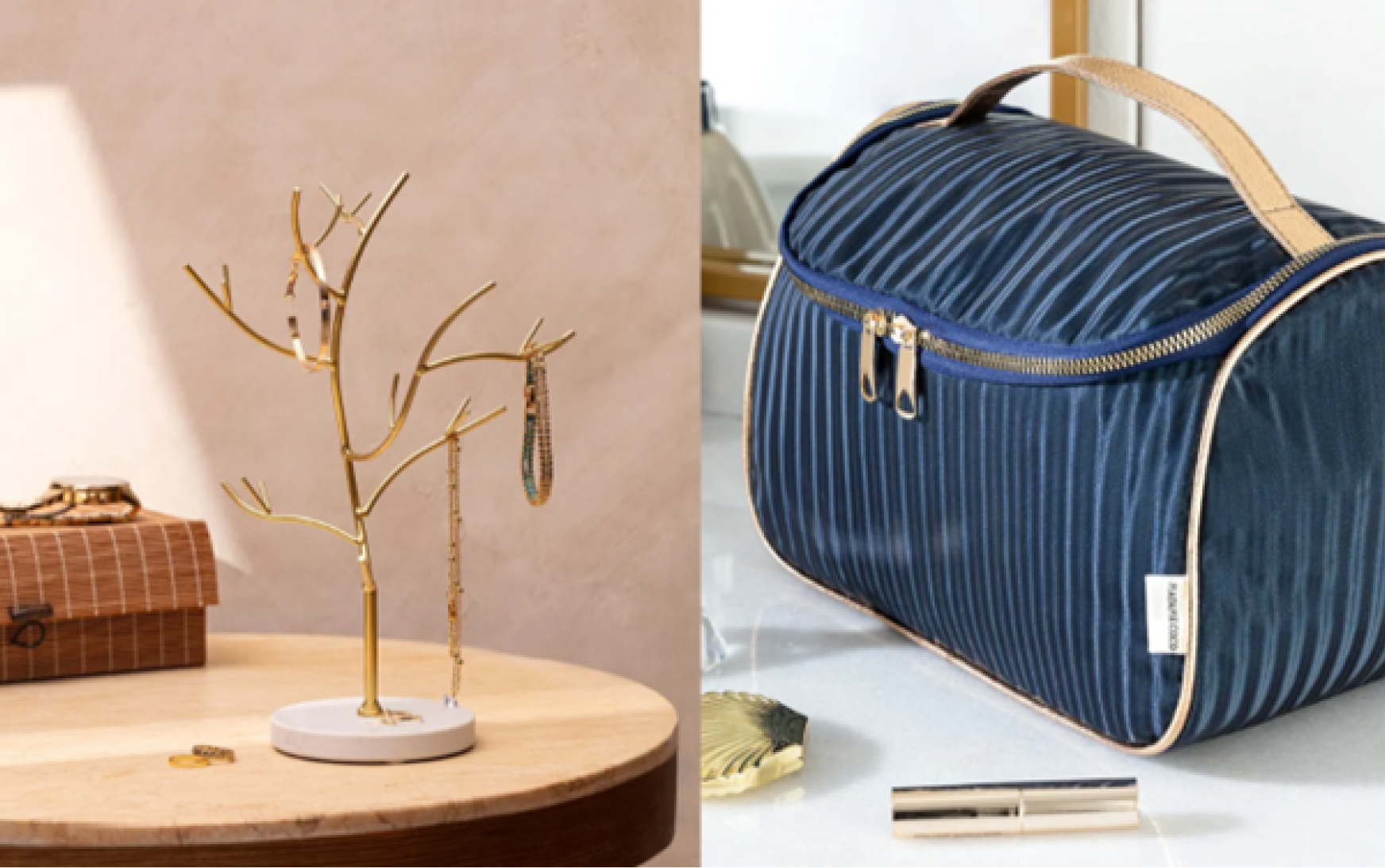 Какой подарок жене покажет, как вы цените ее и заботитесь об ее отдыхе? Презент должен быть для персонального пользования, например металлическая вешалка для украшений в форме дерева и элегантная темно-синяя косметичка, которые будут эффектно смотреться на трюмо или прикроватном столике.