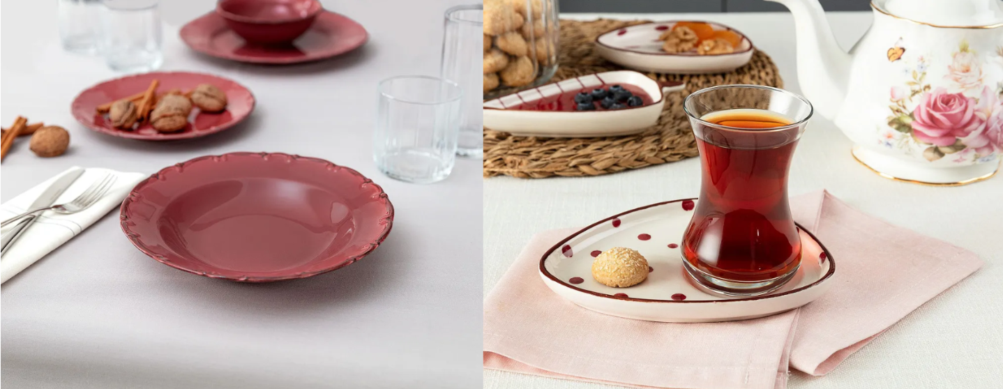 Для кухни. Используйте всю магию посуды. Поставьте рубиновую тарелку Bastien для десертов, прозрачные армуды для чая и к ним — бело-красное керамическое блюдо Vie Rouge Oiseau Family.