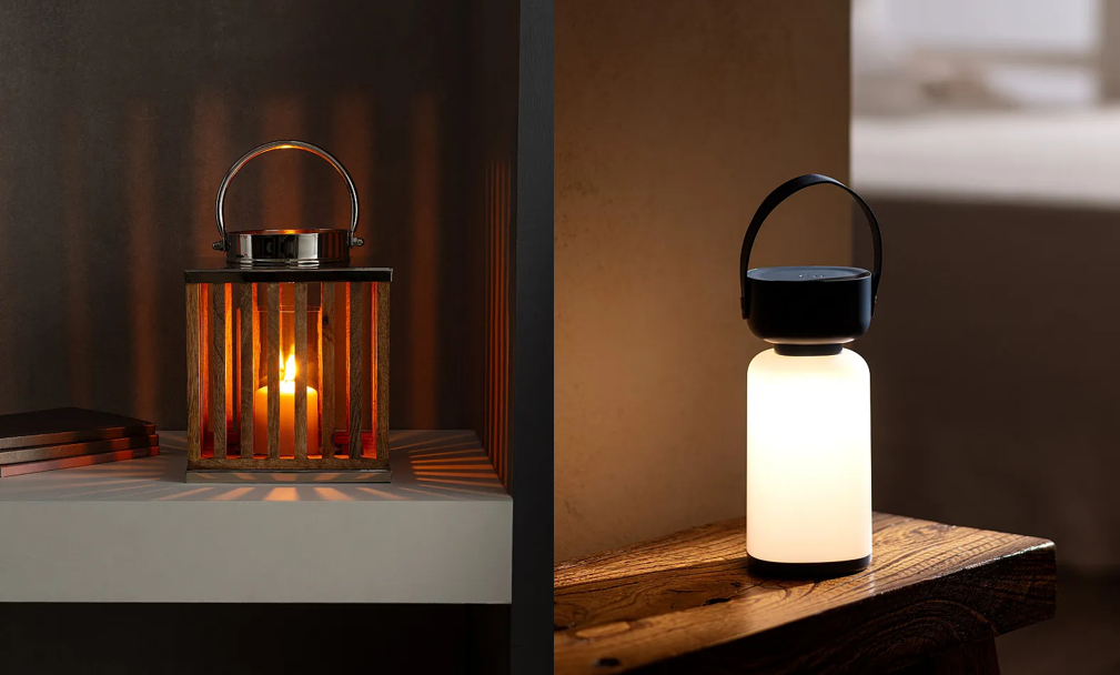 Для гостиной. Основное верхнее освещение в доме должно быть приглушено, его можно вообще отключить, чтобы свет исходил снизу — от гирлянд и свечей. Это создает мягкие тени, которые танцуют по стенам. Такое освещение не только красиво, оно физически воздействует на организм и расслабляет. Празднично и волшебно будут выглядеть подсвечник-фонарь Ambre и оригинальный светильник Laia из пластика.