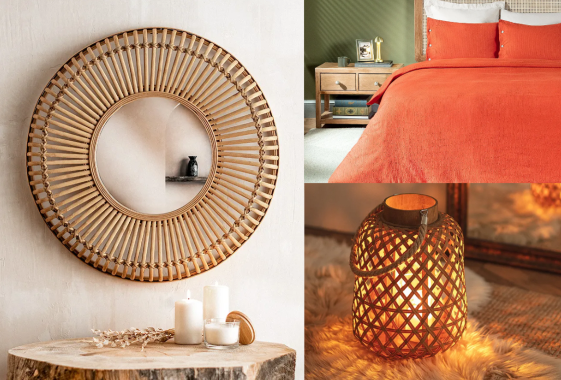 В спальне. Повесьте зеркало с рамкой из 100% бамбука, а для ярких акцентов — застелите оранжевый комплект постельного белья Linda из 100% хлопка. Используйте мягкий свет уютных подсвечников Philippe Lantern на прикроватных тумбочках.