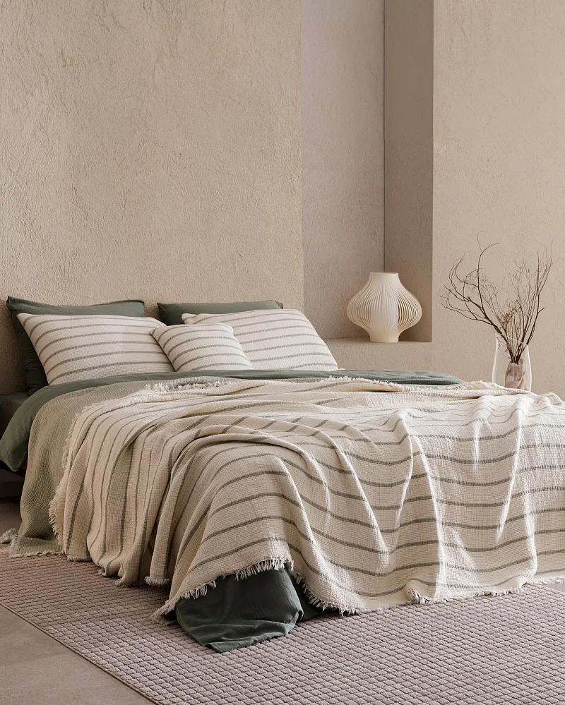 Двуспальный Marguerite с настроением легкого прибрежного стиля. Покрывало с горизонтальными полосами в серо-бежевой гамме делает комплект универсальным: он гармонично впишется как в скандинавский интерьер, так и в средиземноморский или современный эко-стиль. Из 5 наволочек 3 — декоративные, выполнены в той же цветовой гамме, что и покрывало, и изготовлены из хлопка с добавлением 30% полиэстера, чтобы повысить износостойкость изделия.