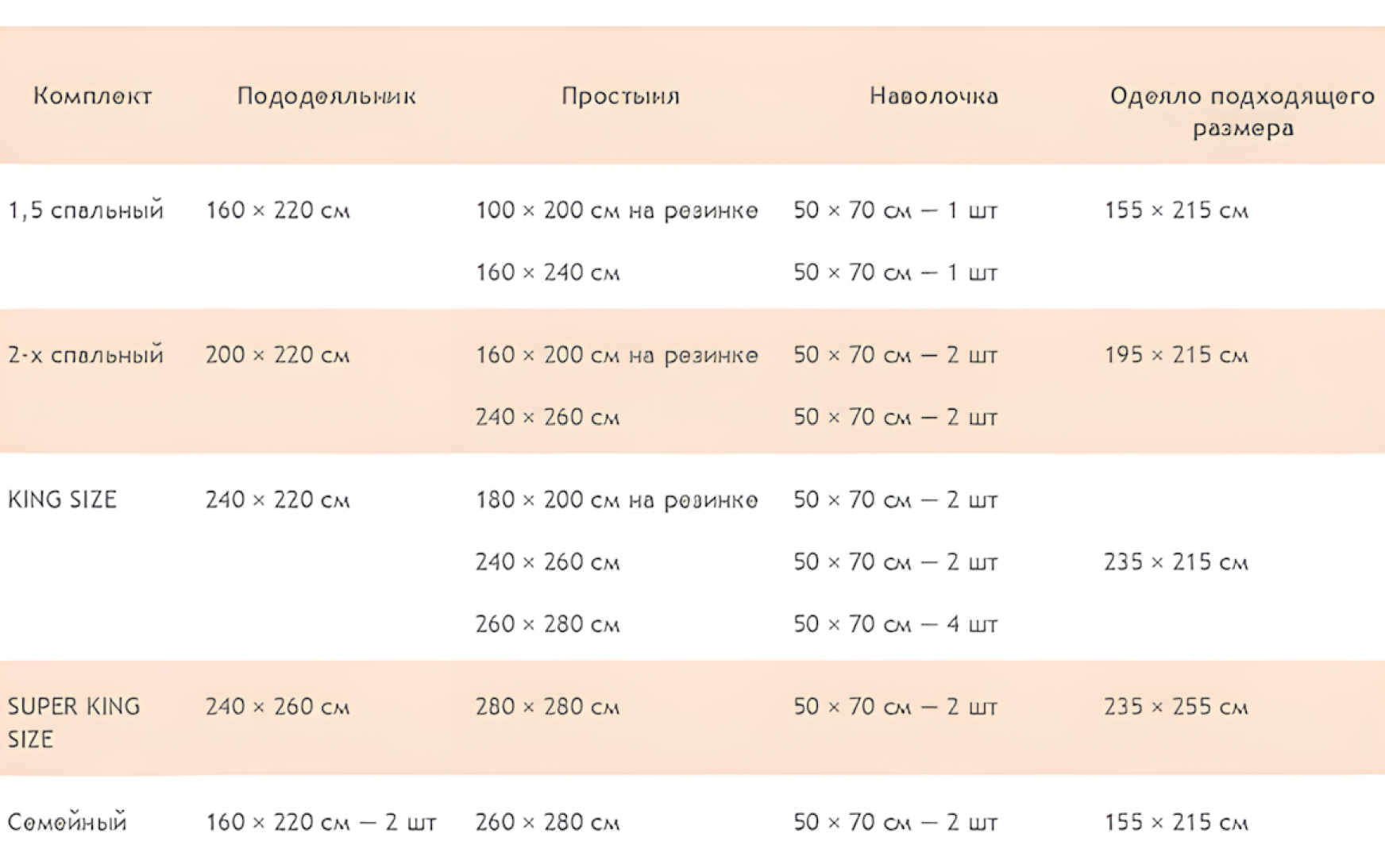 Таблица размеров одеял