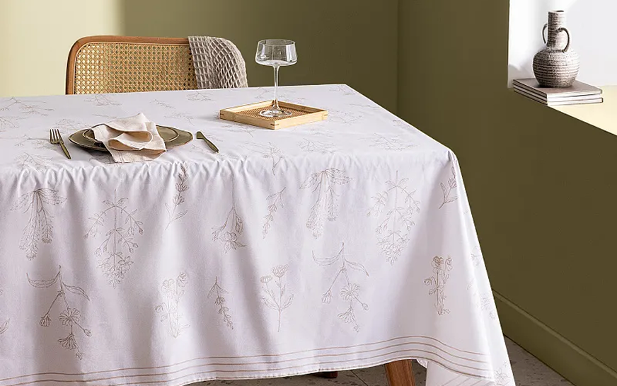 - Размер: скатерть должна свисать от края стола на 20–35 см, чтобы создать аккуратный и гармоничный вид. Для больших столов или официальных мероприятий можно выбрать более длинные скатерти, свисающие до пола.