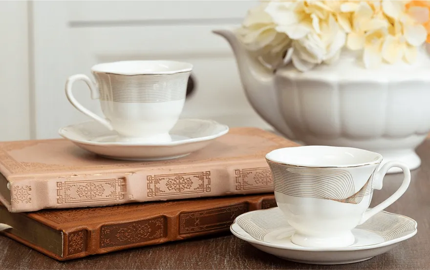 Еще один интересный вариант – яркие ленточки из атласа, украшающие ручки чашек.