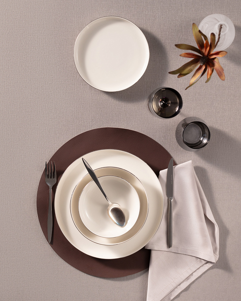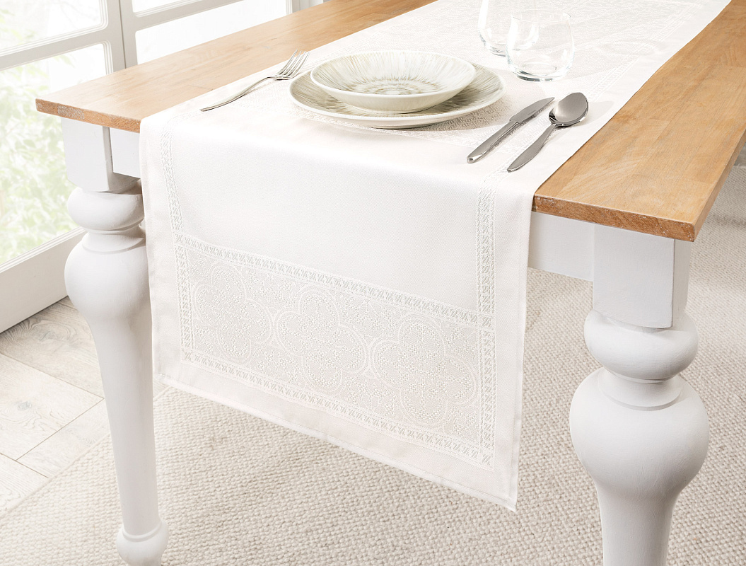 Для званого ужина или обеда украсьте поверх дорожкой Moroccon. Гости оценят эстетику Cloud Dancer, если стол будет сервирован тарелками из сервизов Madelyn или Viola.